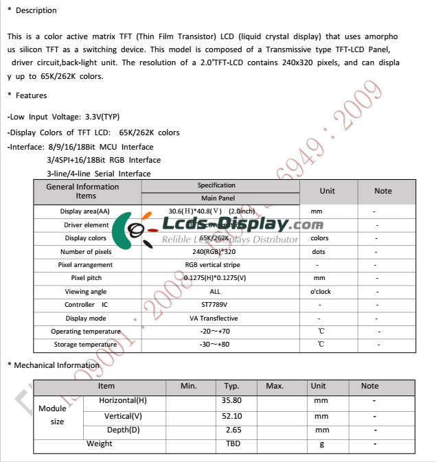 | キーワードDesc。 | 2.0 inch, 240*320, 45pins, 250nits, MCU interface, TFT Module |